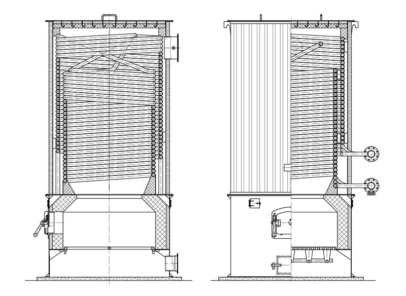爐體內(nèi)、外螺旋盤管采用多頭、小管徑鋼管制成,盤管的熱膨脹性能好、應(yīng)力低,安全可靠。